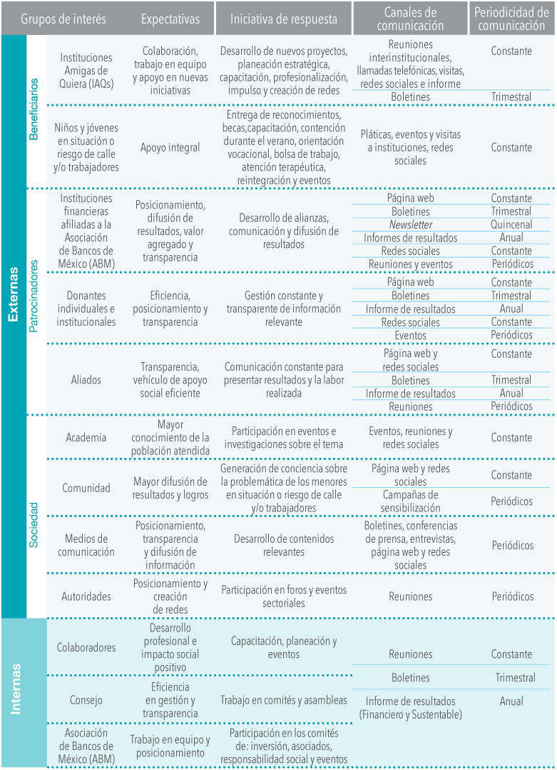 Hemos reconocido, a partir de la interacción con los mismos, a nuestros grupos de interés, sus necesidades y expectativas frente a Fundación Quiera; para ello, hemos establecido diversas estrategias de comunicación que nos permiten mantener una relación fluida así como desarrollar iniciativas de respuesta. Esta relación es una pieza central para el desarrollo institucional y la eficiencia de nuestra operación.